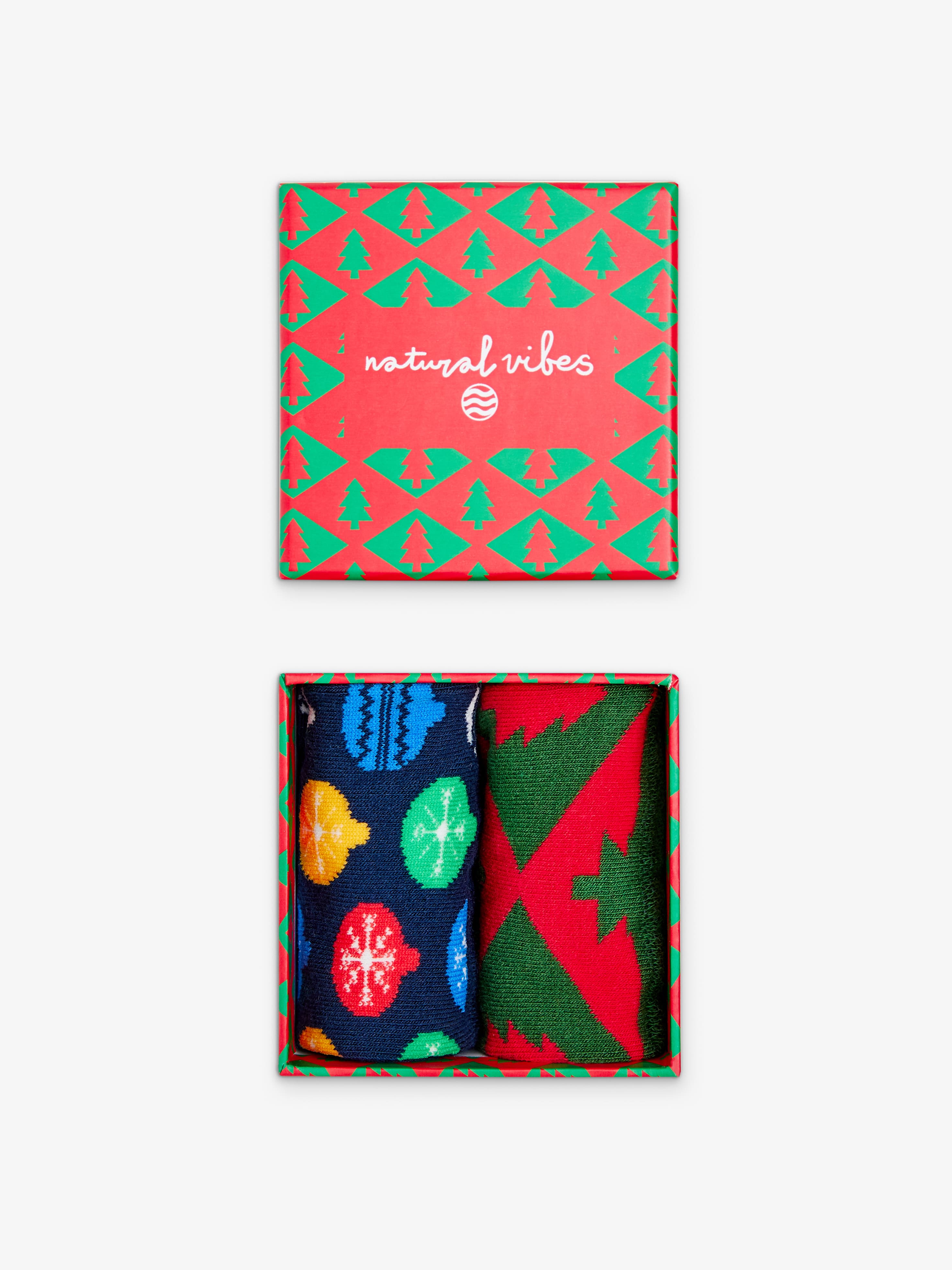 Da kommt Weihnachtsstimmung auf! Unser Set mit zwei Paar weihnachtlichen Bio-Socken in einer schönen Geschenkschachtel.