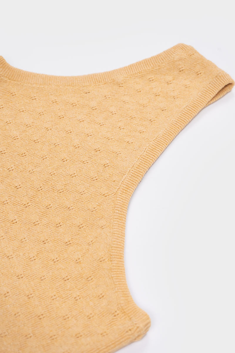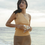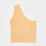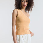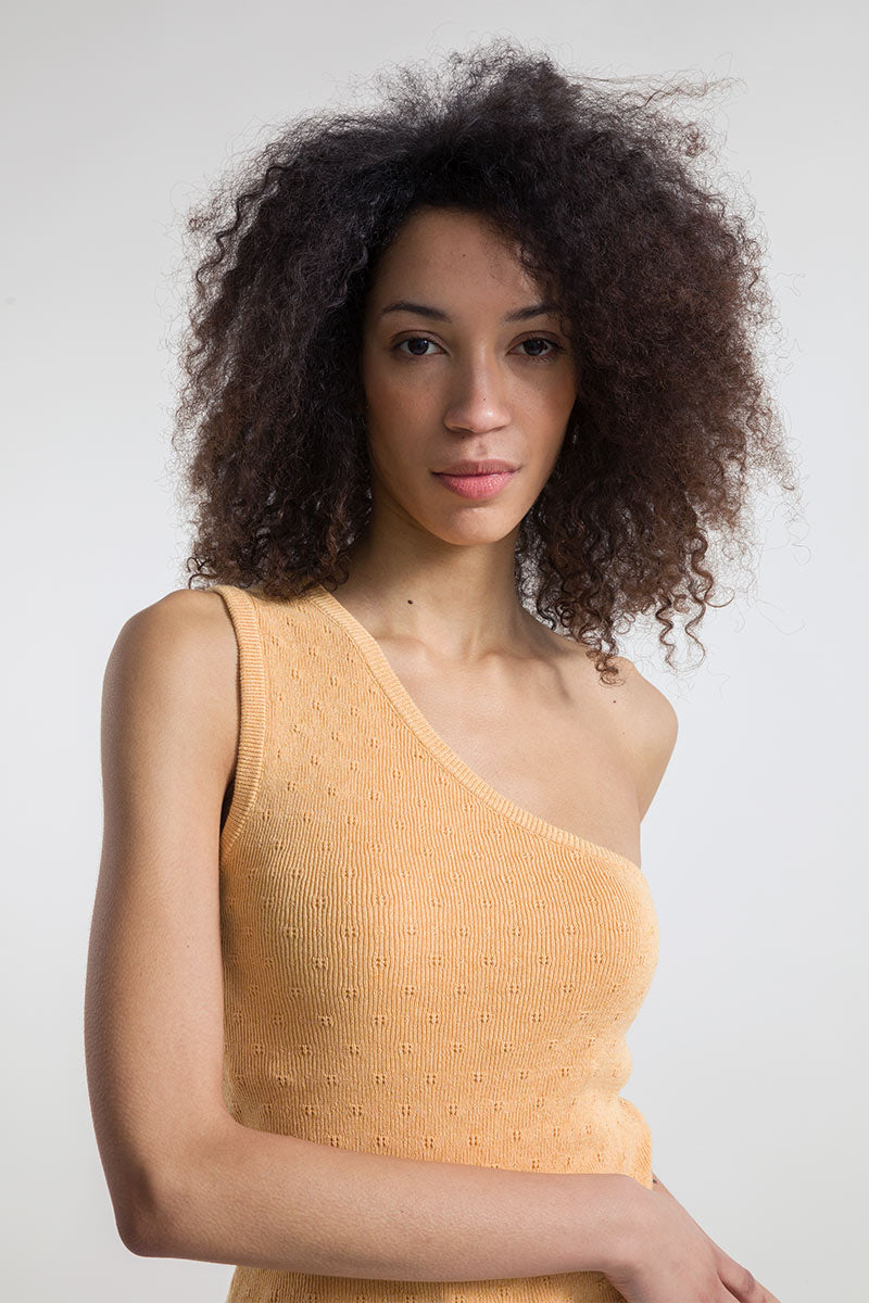 Dieses sommerliche One-Shoulder-Top ist aus einer Mischung aus recycelter und biologischer Baumwolle hergestellt. Die recycelte Baumwolle stammt aus Produktionsüberschüssen, die nach Farbe sortiert wurden, um ein neues Färbeverfahren zu vermeiden.