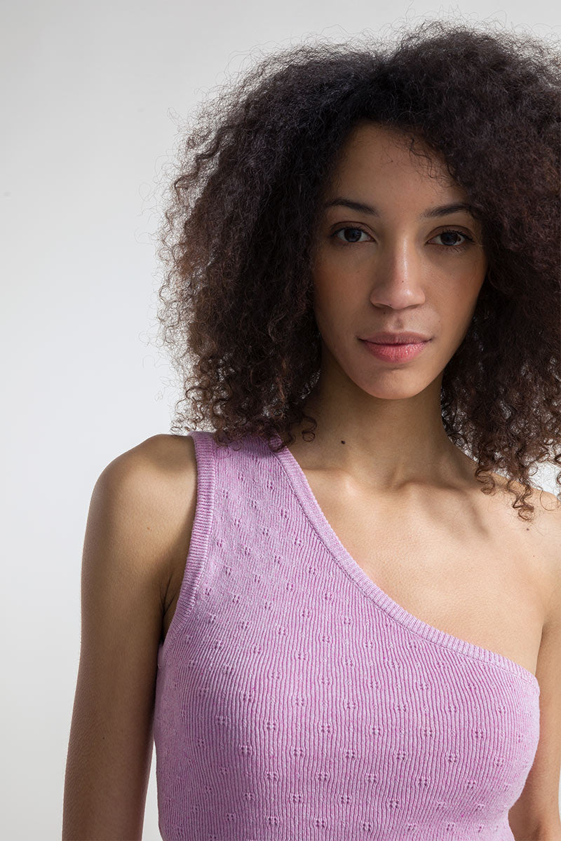 Dieses sommerliche One-Shoulder-Top ist aus einer Mischung aus recycelter und biologischer Baumwolle hergestellt. Die recycelte Baumwolle stammt aus Produktionsüberschüssen, die nach Farbe sortiert wurden, um ein neues Färbeverfahren zu vermeiden.