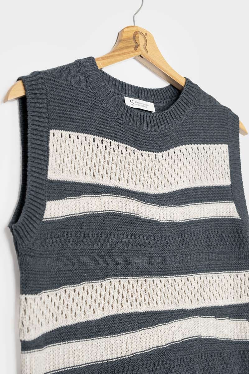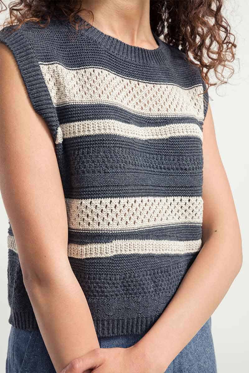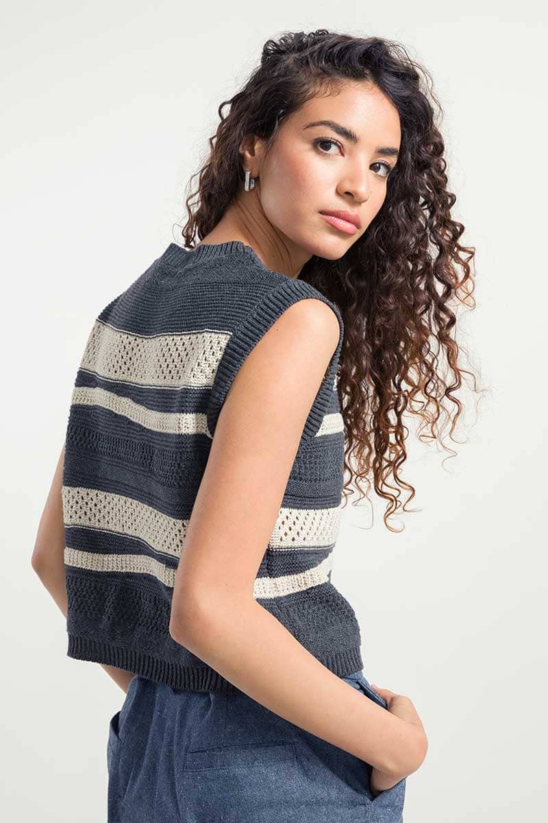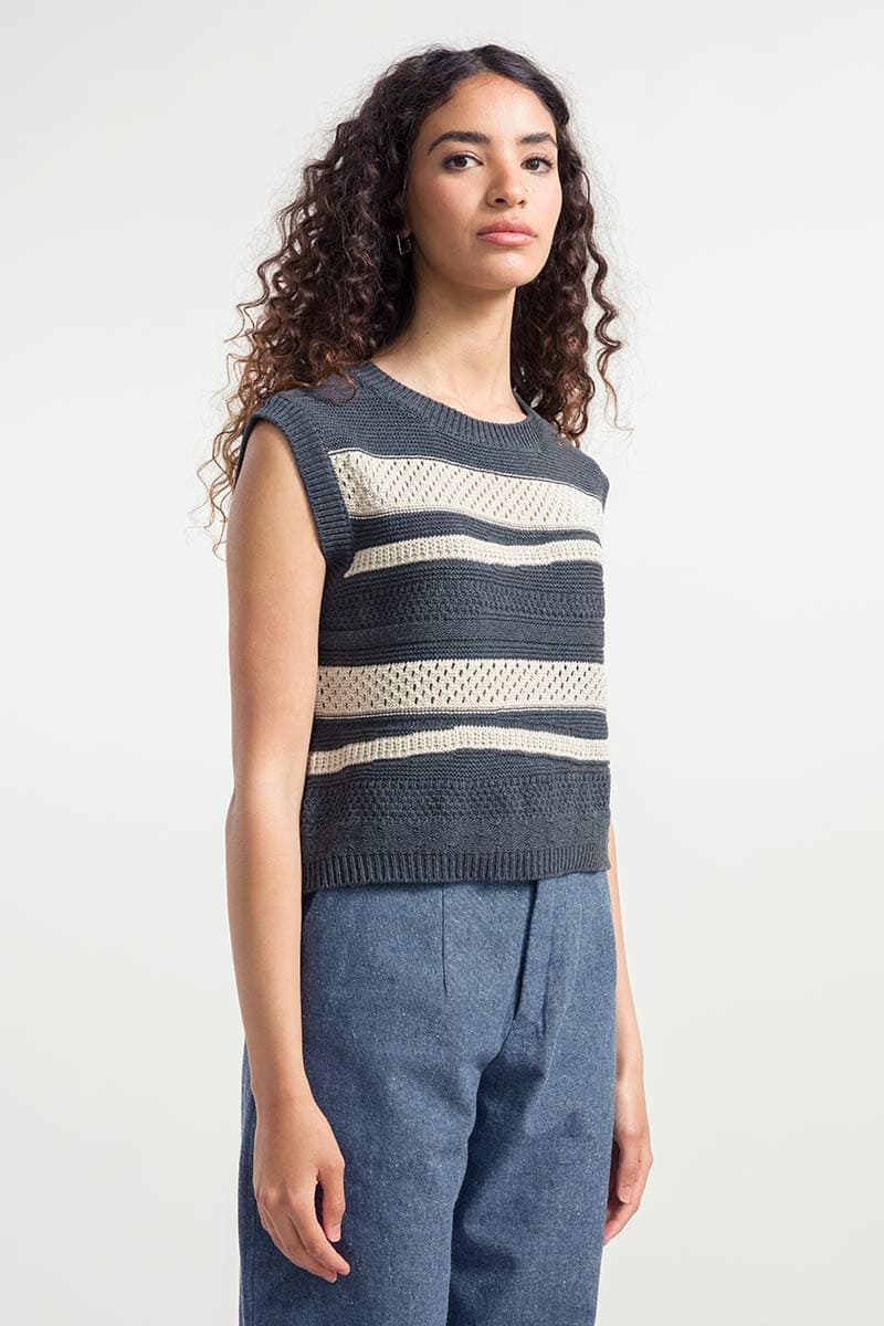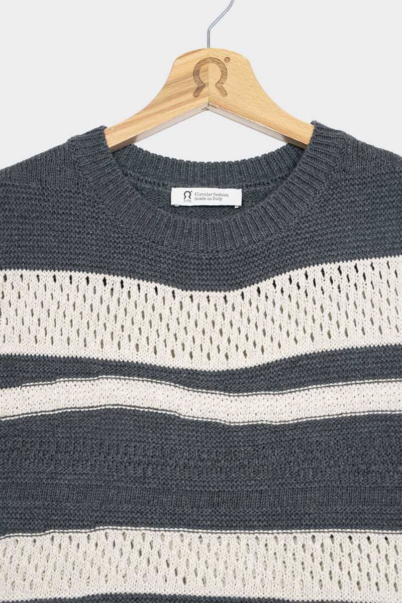 Cassandra ist ein Damen-Top mit Rundhalsausschnitt, das aus mehreren Strickmaschen besteht, die ihm eine dreidimensionale Struktur verleihen. Das gestreifte Oberteil besteht aus einem nachhaltigen Baumwollgarn, das zur Hälfte aus biologischem Anbau und zur Hälfte aus recycelten Industrieabfällen hergestellt wird und somit vollständig biologisch abbaubar ist.