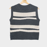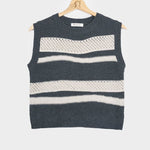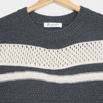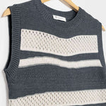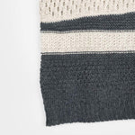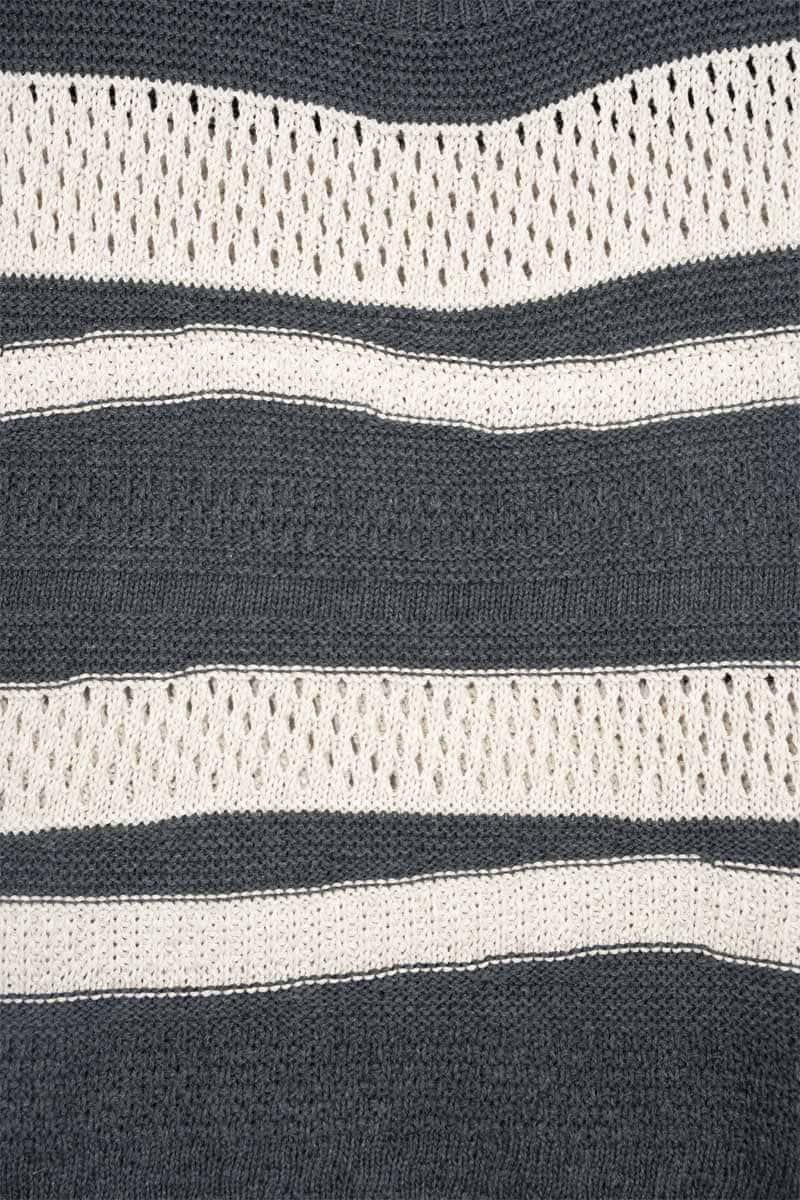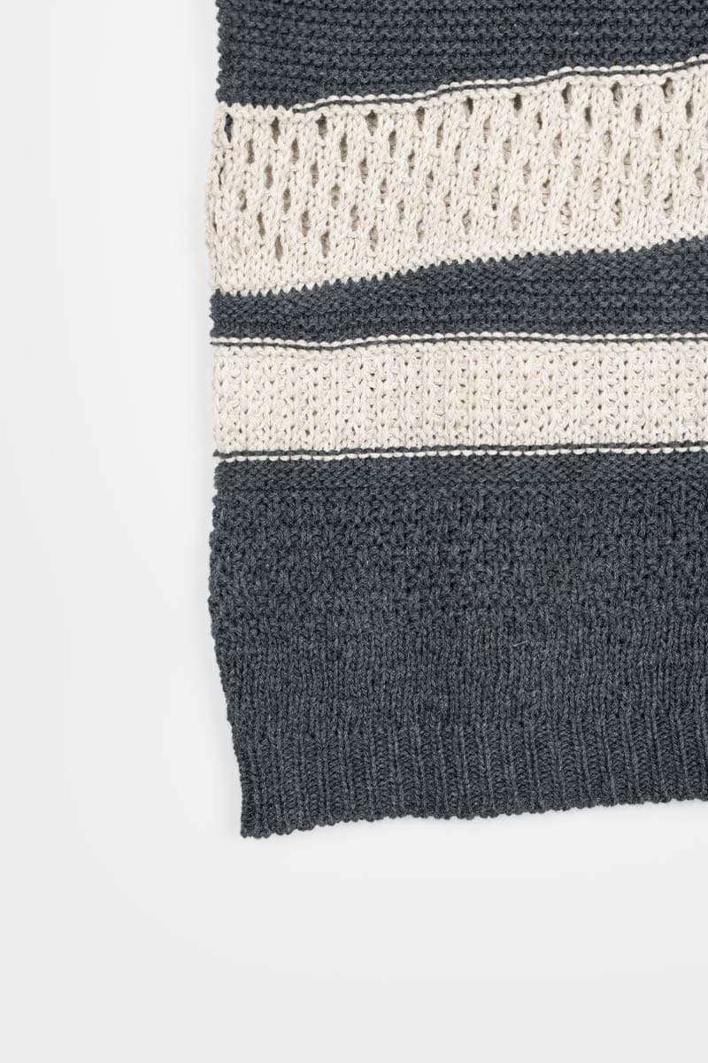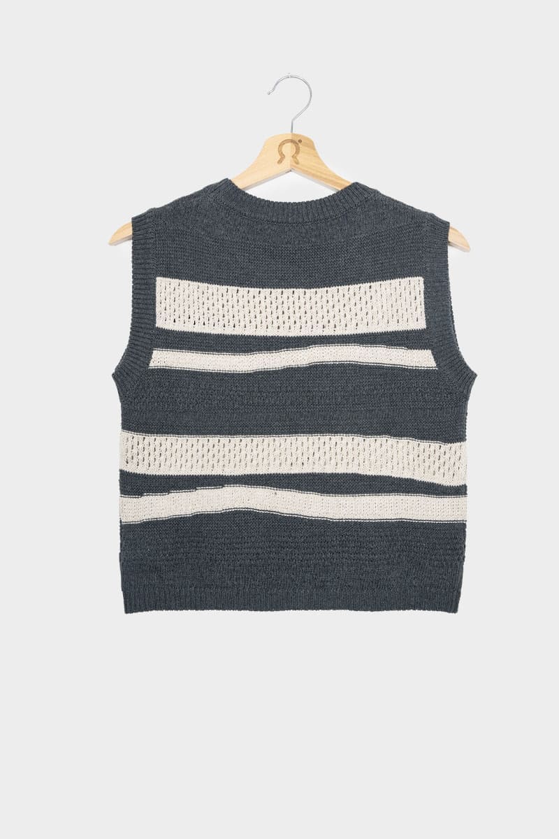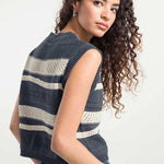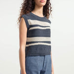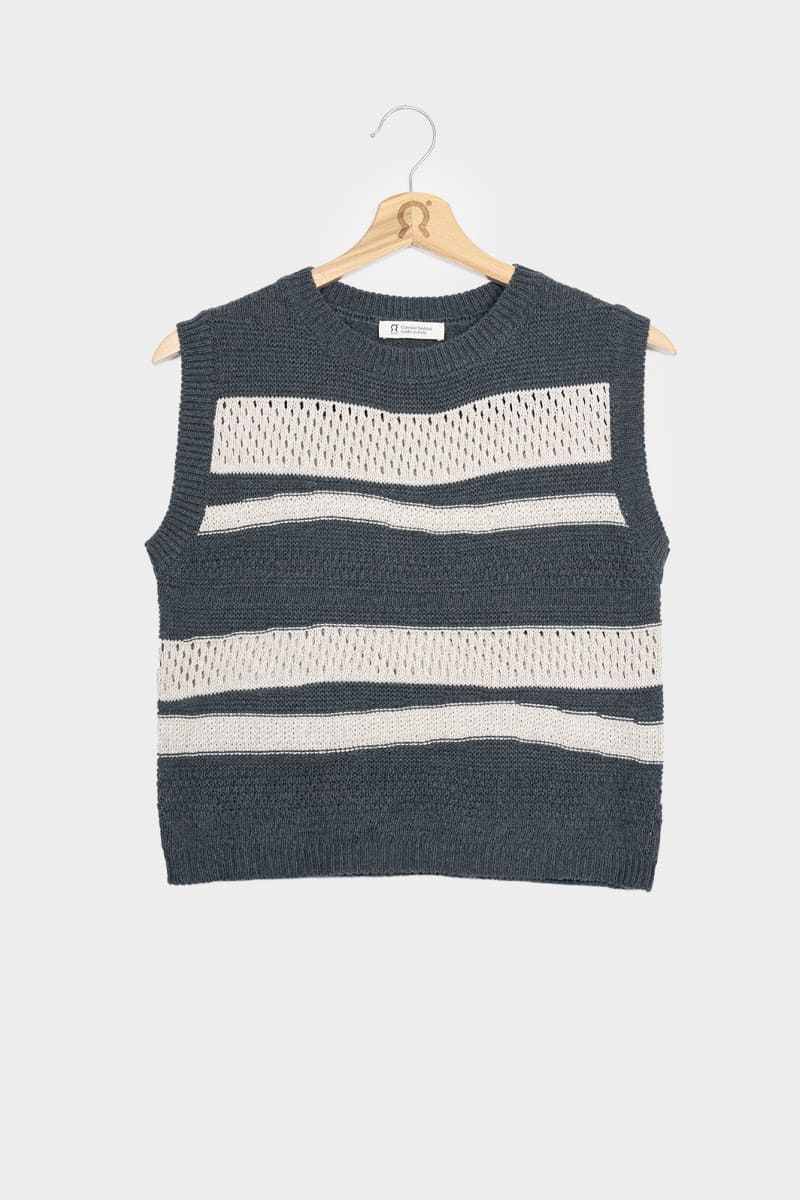 Cassandra ist ein Damen-Top mit Rundhalsausschnitt, das aus mehreren Strickmaschen besteht, die ihm eine dreidimensionale Struktur verleihen. Das gestreifte Oberteil besteht aus einem nachhaltigen Baumwollgarn, das zur Hälfte aus biologischem Anbau und zur Hälfte aus recycelten Industrieabfällen hergestellt wird und somit vollständig biologisch abbaubar ist.