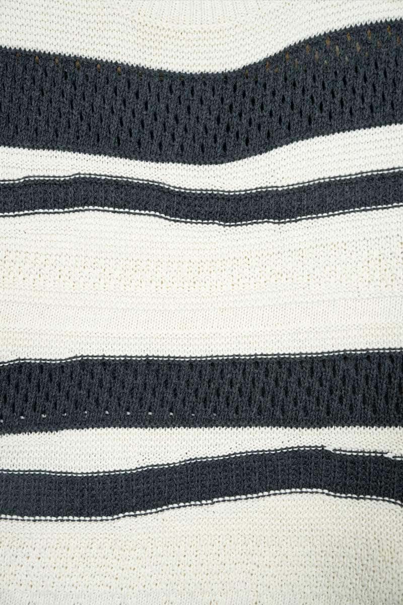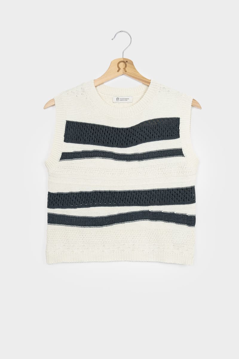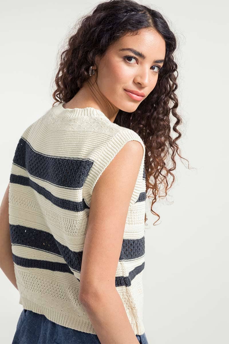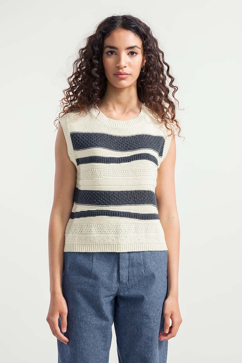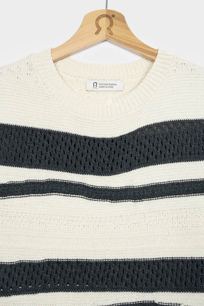 Cassandra ist ein Damen-Top mit Rundhalsausschnitt, das aus mehreren Strickmaschen besteht, die ihm eine dreidimensionale Struktur verleihen. Das gestreifte Oberteil besteht aus einem nachhaltigen Baumwollgarn, das zur Hälfte aus biologischem Anbau und zur Hälfte aus recycelten Industrieabfällen hergestellt wird und somit vollständig biologisch abbaubar ist.