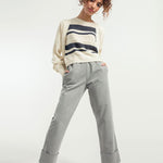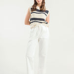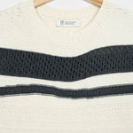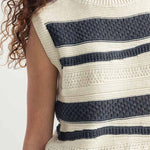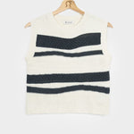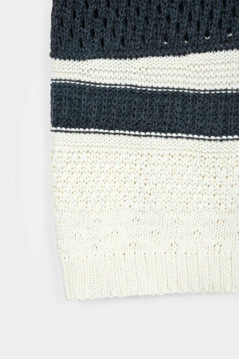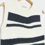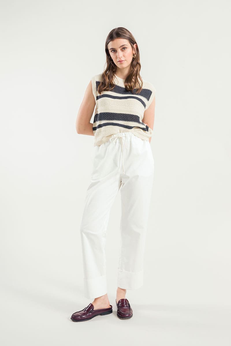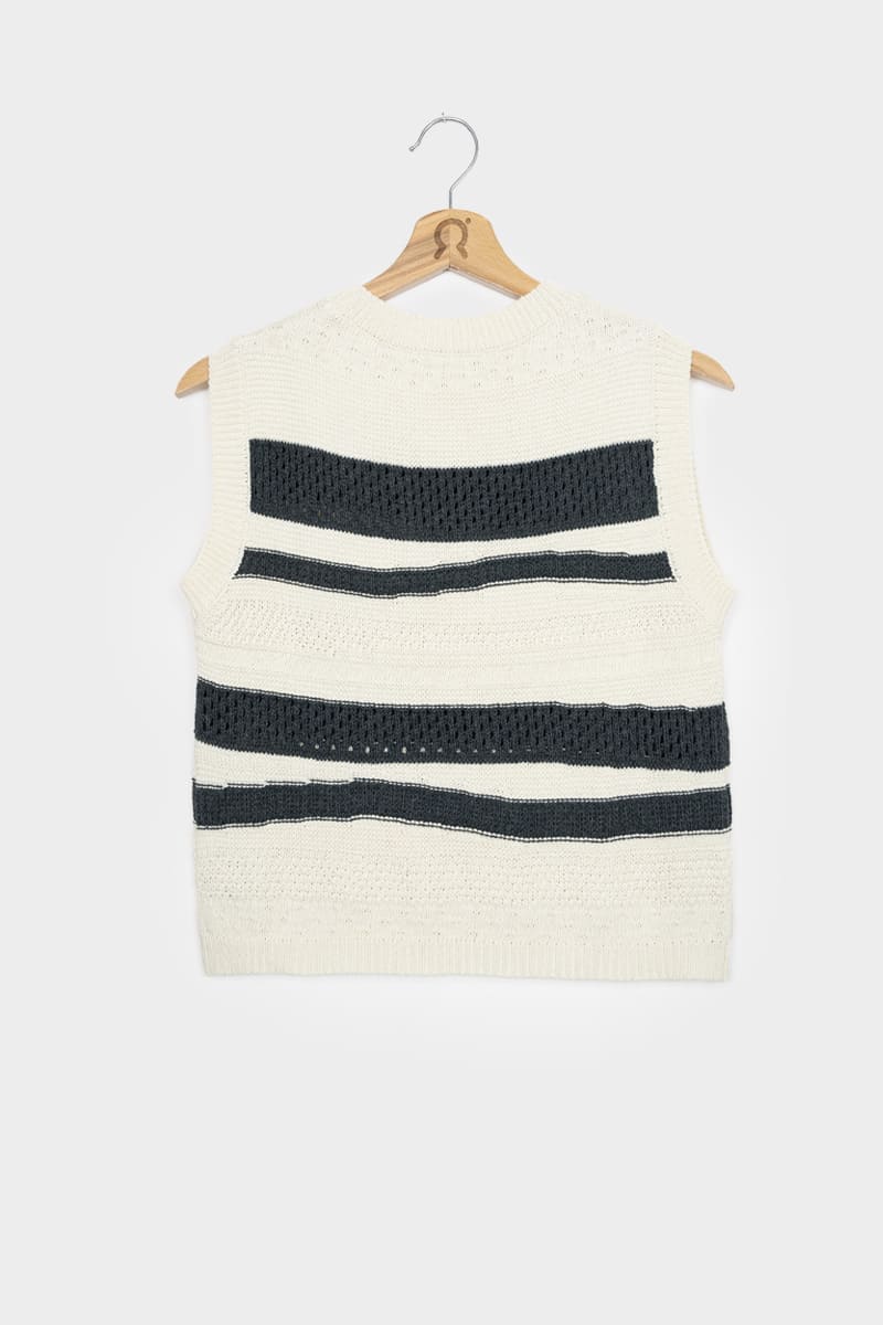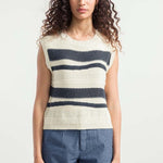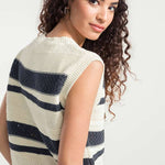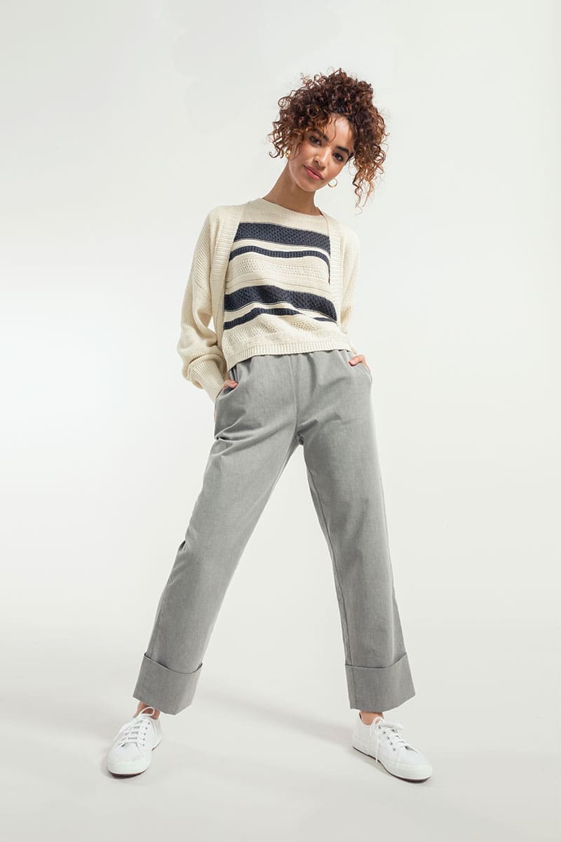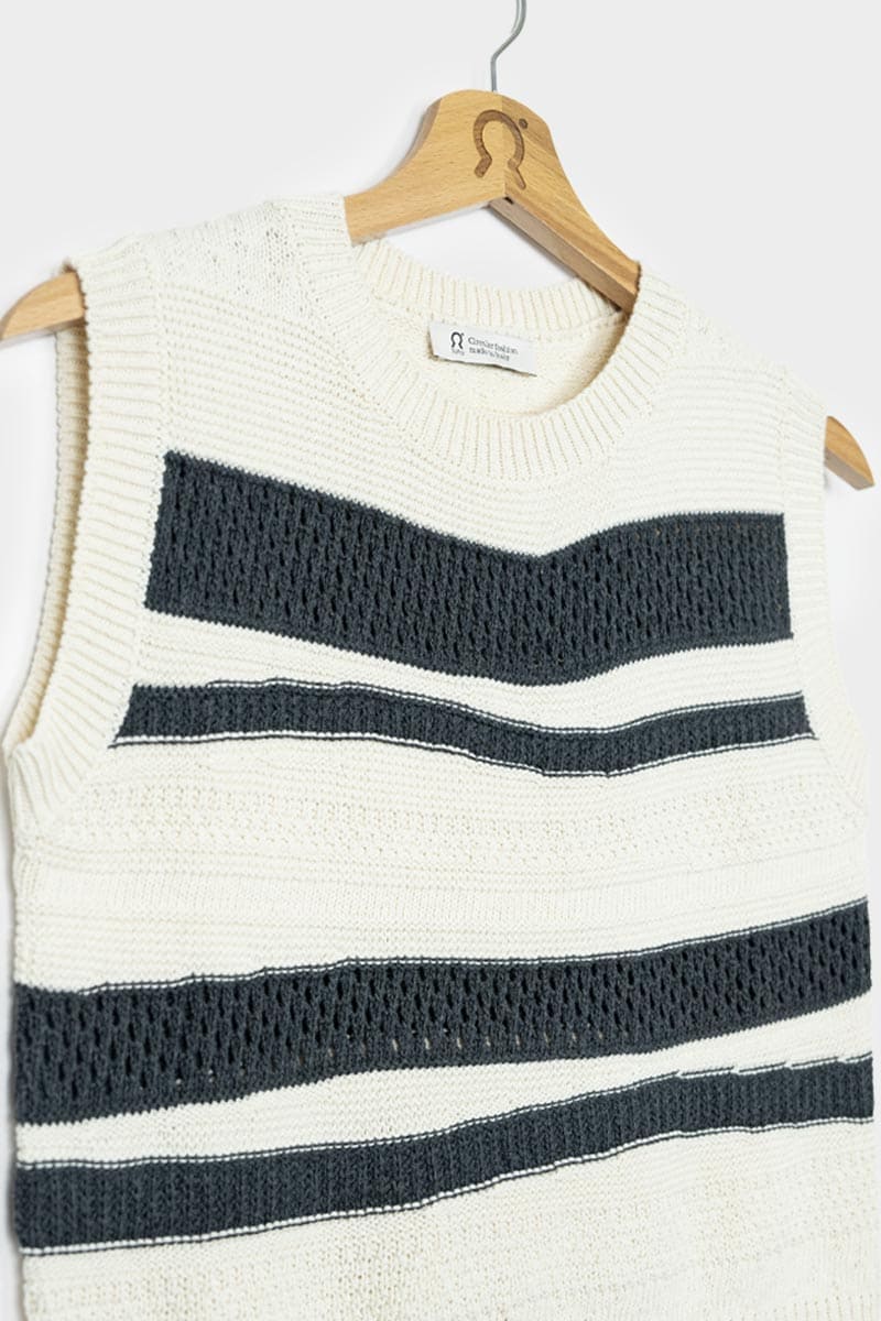 Cassandra ist ein Damen-Top mit Rundhalsausschnitt, das aus mehreren Strickmaschen besteht, die ihm eine dreidimensionale Struktur verleihen. Das gestreifte Oberteil besteht aus einem nachhaltigen Baumwollgarn, das zur Hälfte aus biologischem Anbau und zur Hälfte aus recycelten Industrieabfällen hergestellt wird und somit vollständig biologisch abbaubar ist.