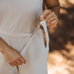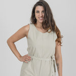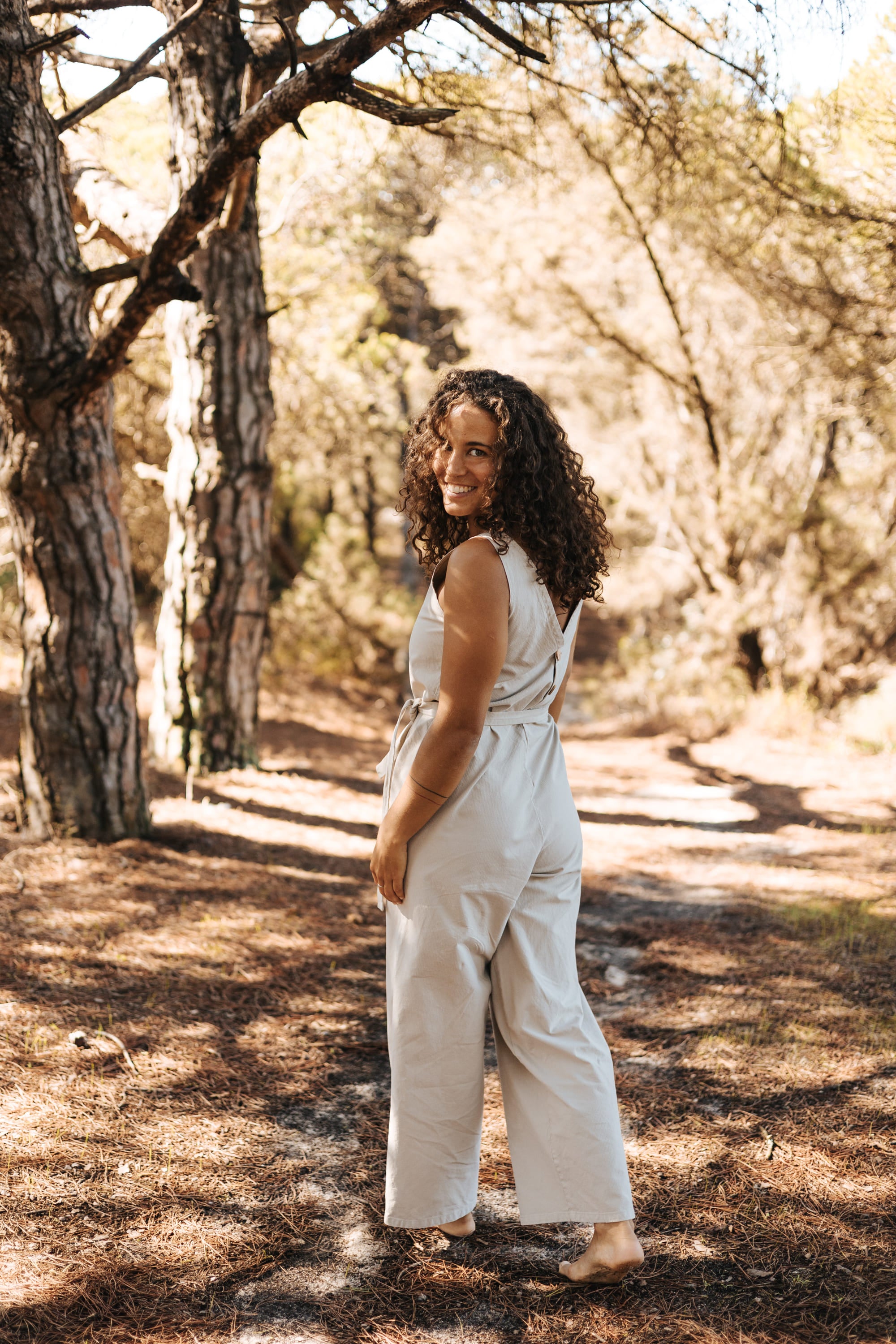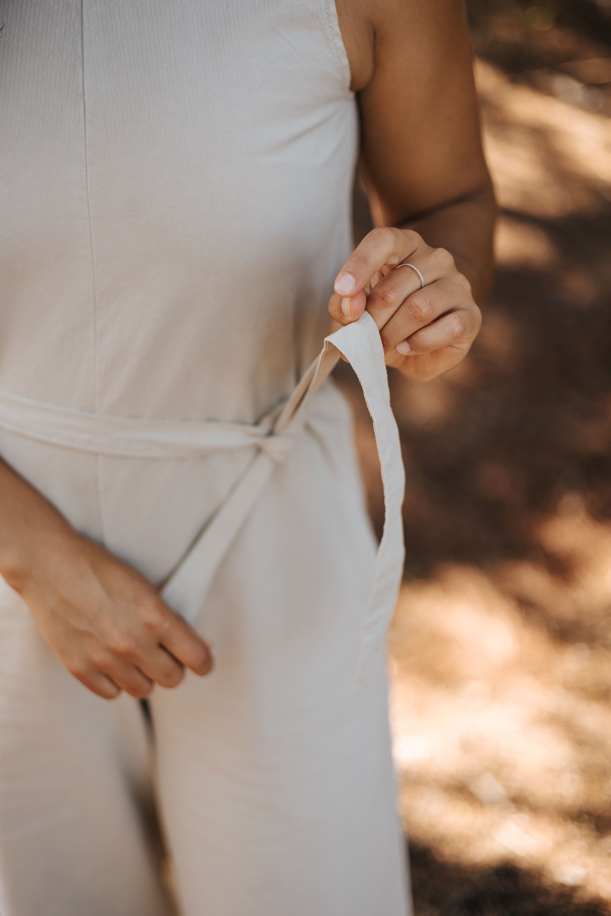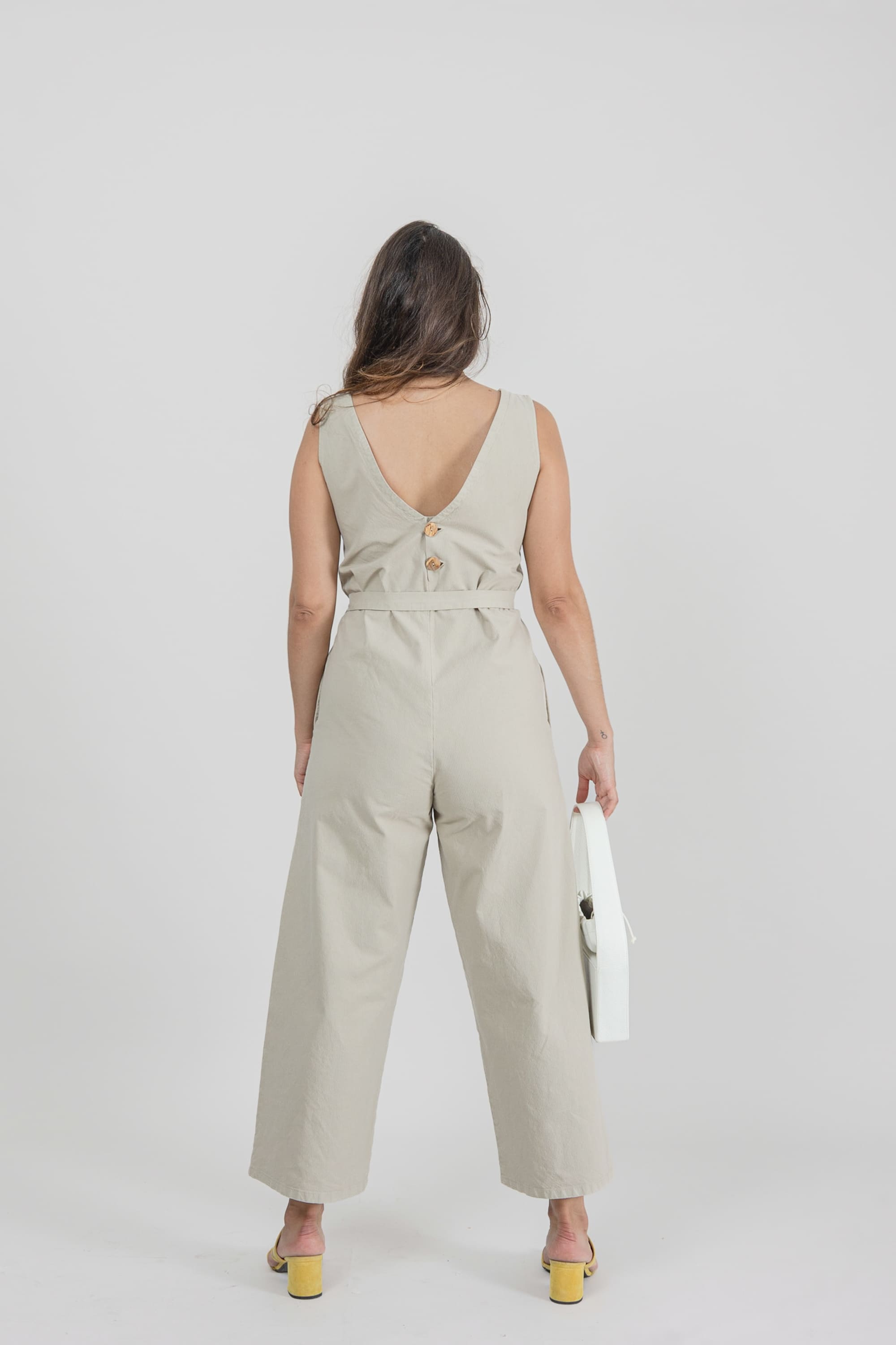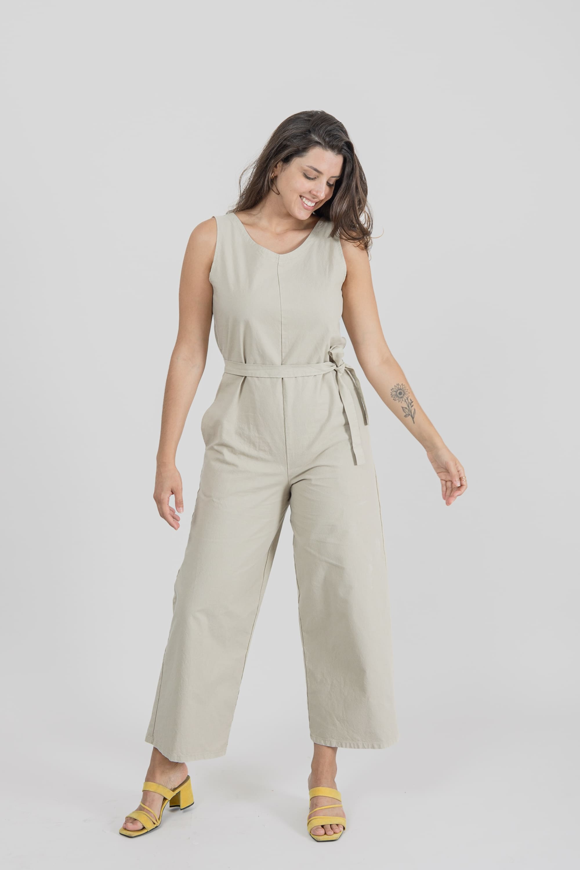 Der Stoff zeichnet sich durch feine Strukturlinien aus, die dem Overall ein schönes Finish verleihen. Der Jumpsuit verfügt über einen abnehmbaren Gürtel für einen maßgeschneiderten Look, einen stilvollen V-Rücken mit Knöpfen zum einfachen An- und Ausziehen sowie praktische Seitentaschen. Dieses vielseitige Stück ist perfekt für mühelos schicke und bequeme Outfits, die sowohl trendig als auch praktisch sind.