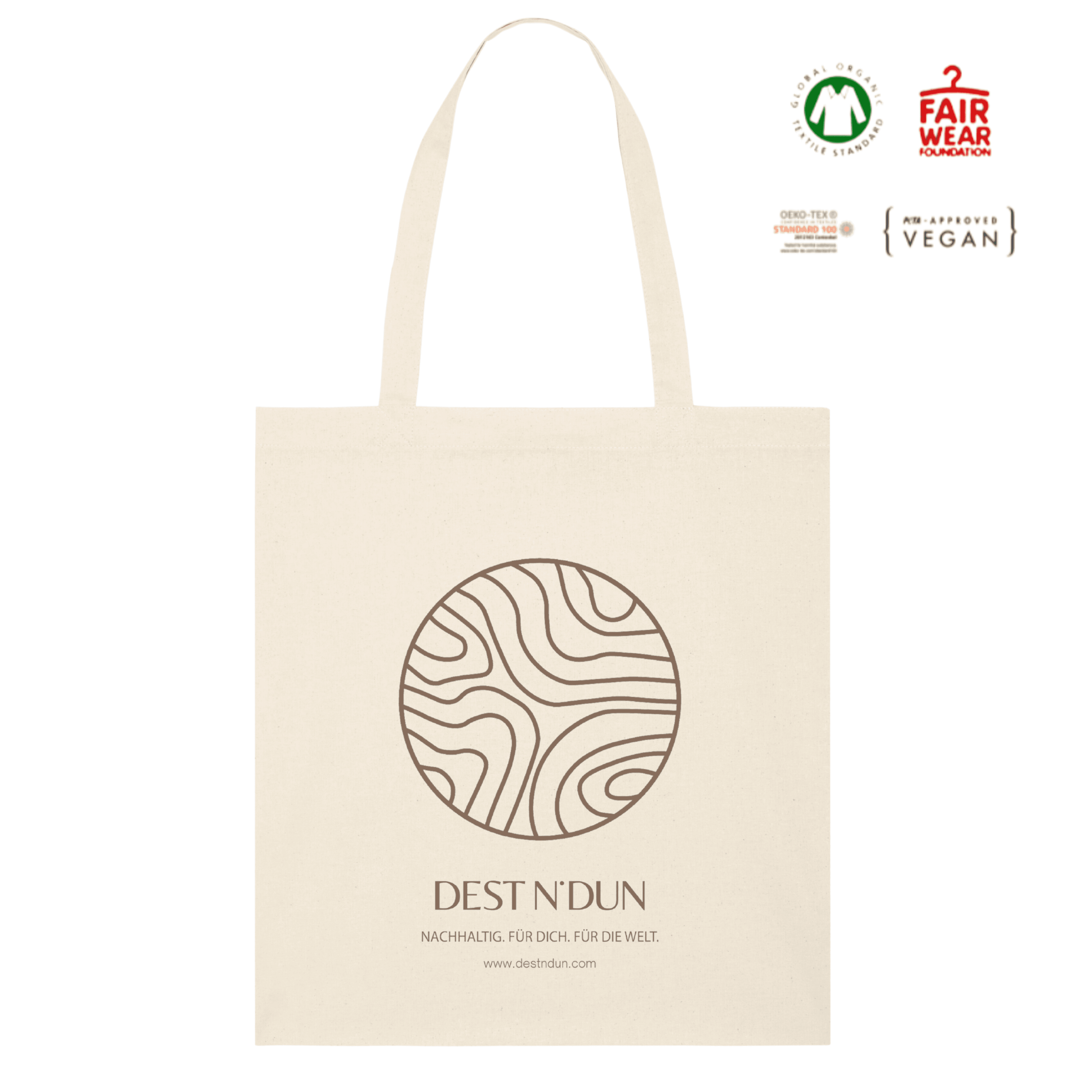 Die DEST N'DUN-Tote Bags sind aus 100% Bio-Baumwolle und FairWear, GOTS, OEKO-TEX und PETA Vegan zertifiziert.