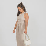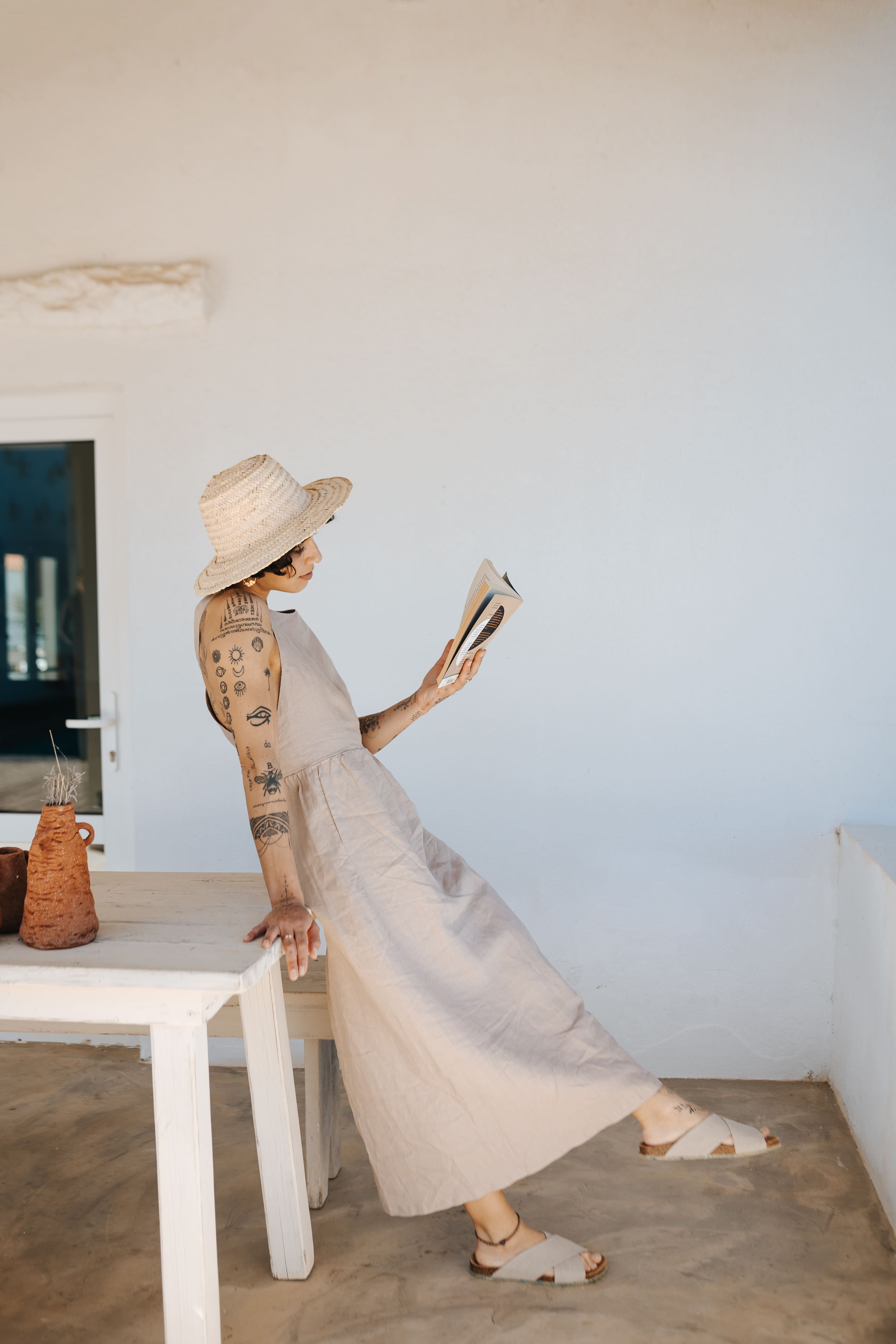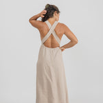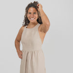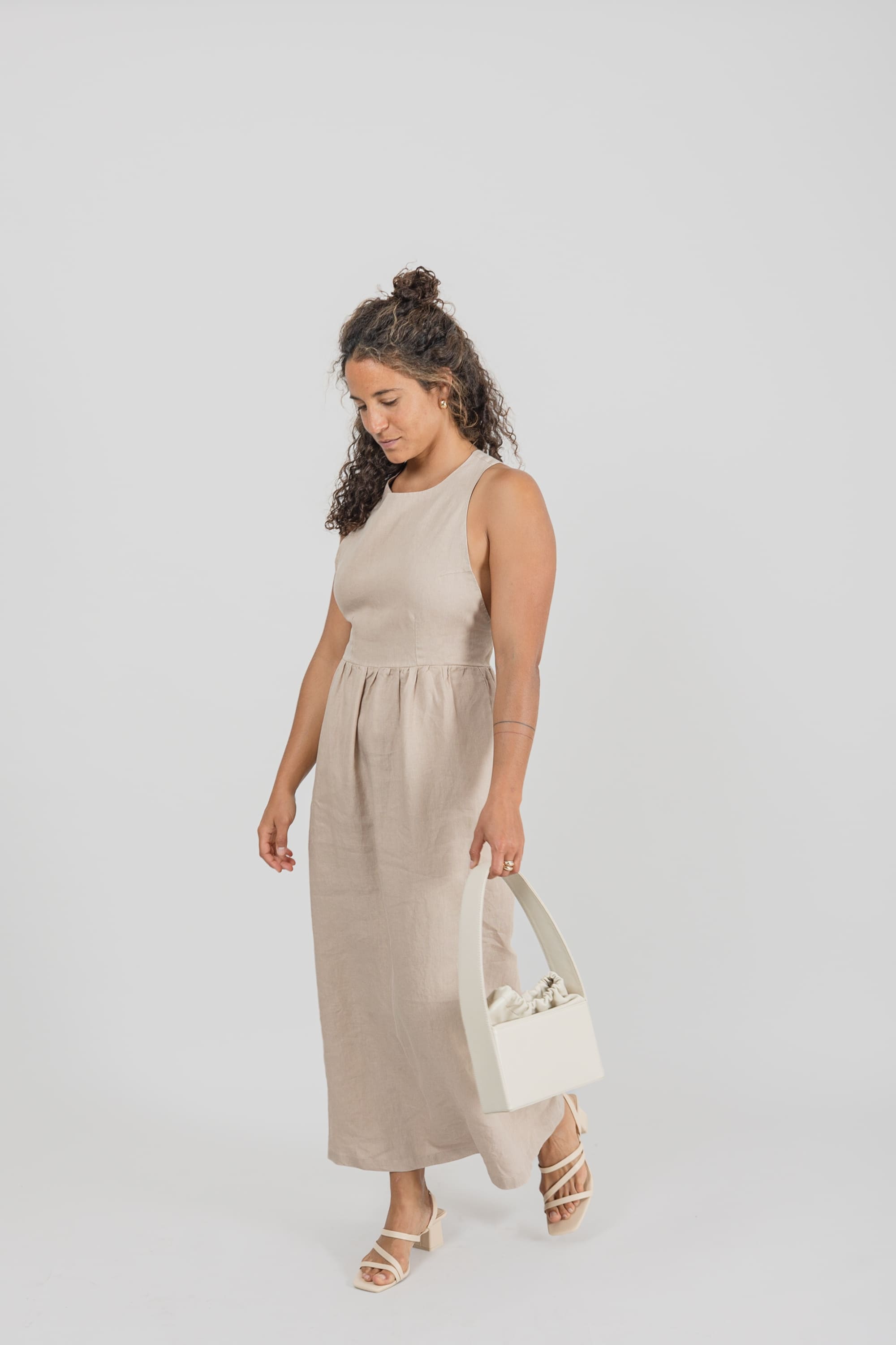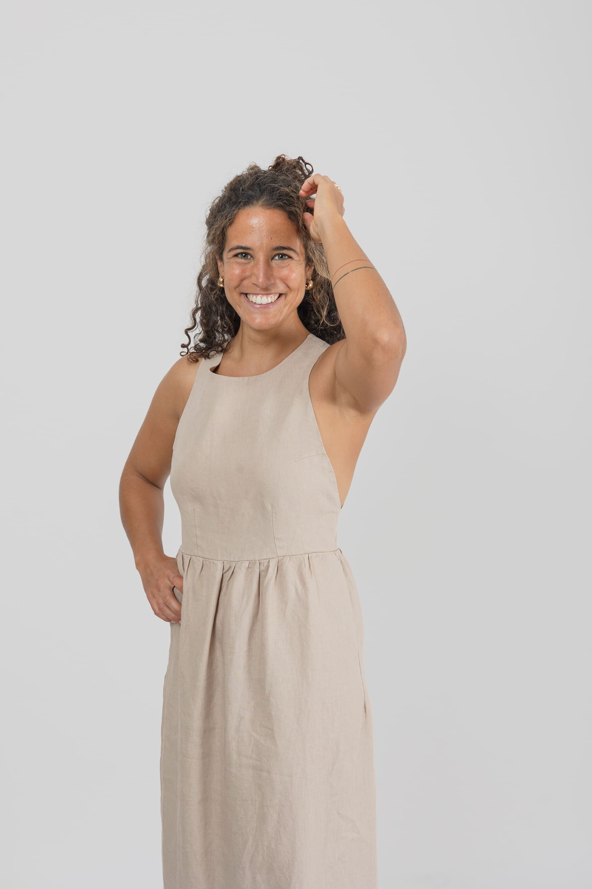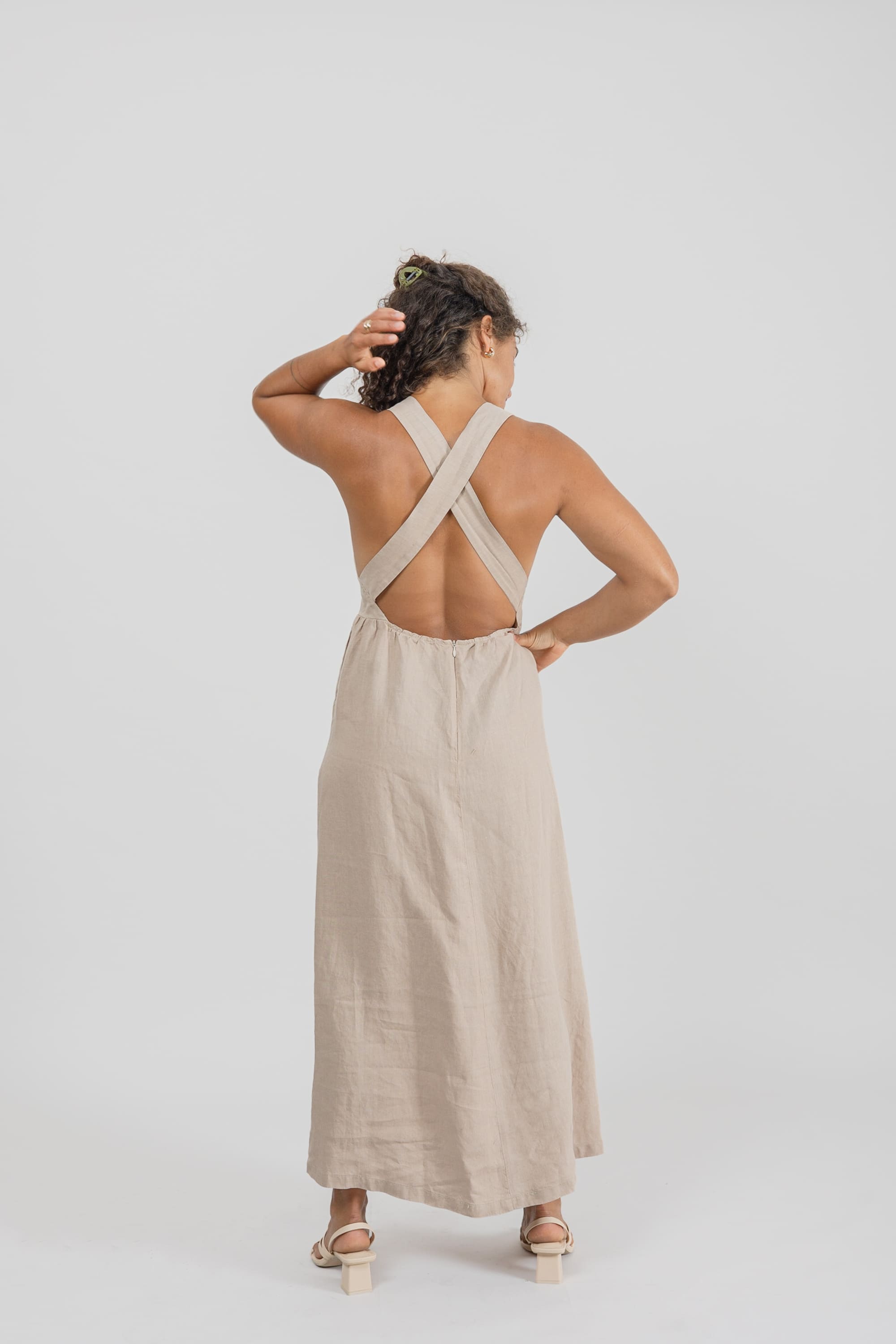 Veredel Dein Sommerstil mit diesem eleganten Kleid aus 100% Leinen. Es verfügt über einen Neckholder, ein tailliertes, gefüttertes Oberteil und einen atemberaubenden, überkreuzten Träger am Rücken für besseren Halt.