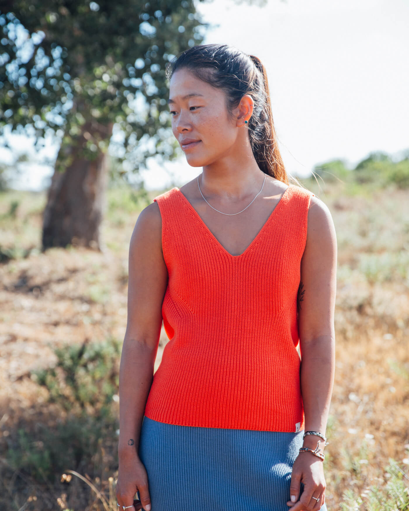 Gefertigt für Sommertage - unser Knit Top besteht aus 100% Bio-Baumwolle. Leicht luftig, mit seinem gestrickten Design, ist es ein großartiges Statement für deinen Kleiderschrank.