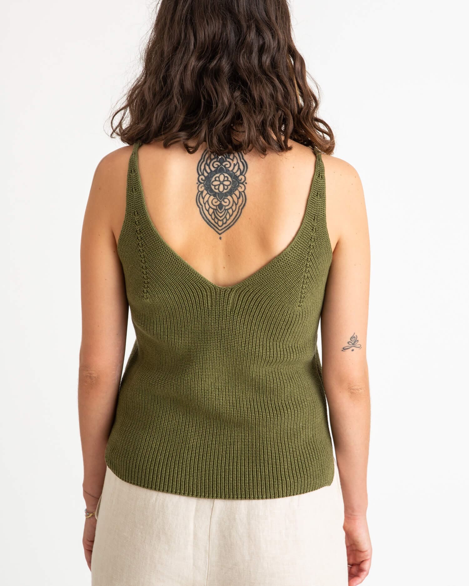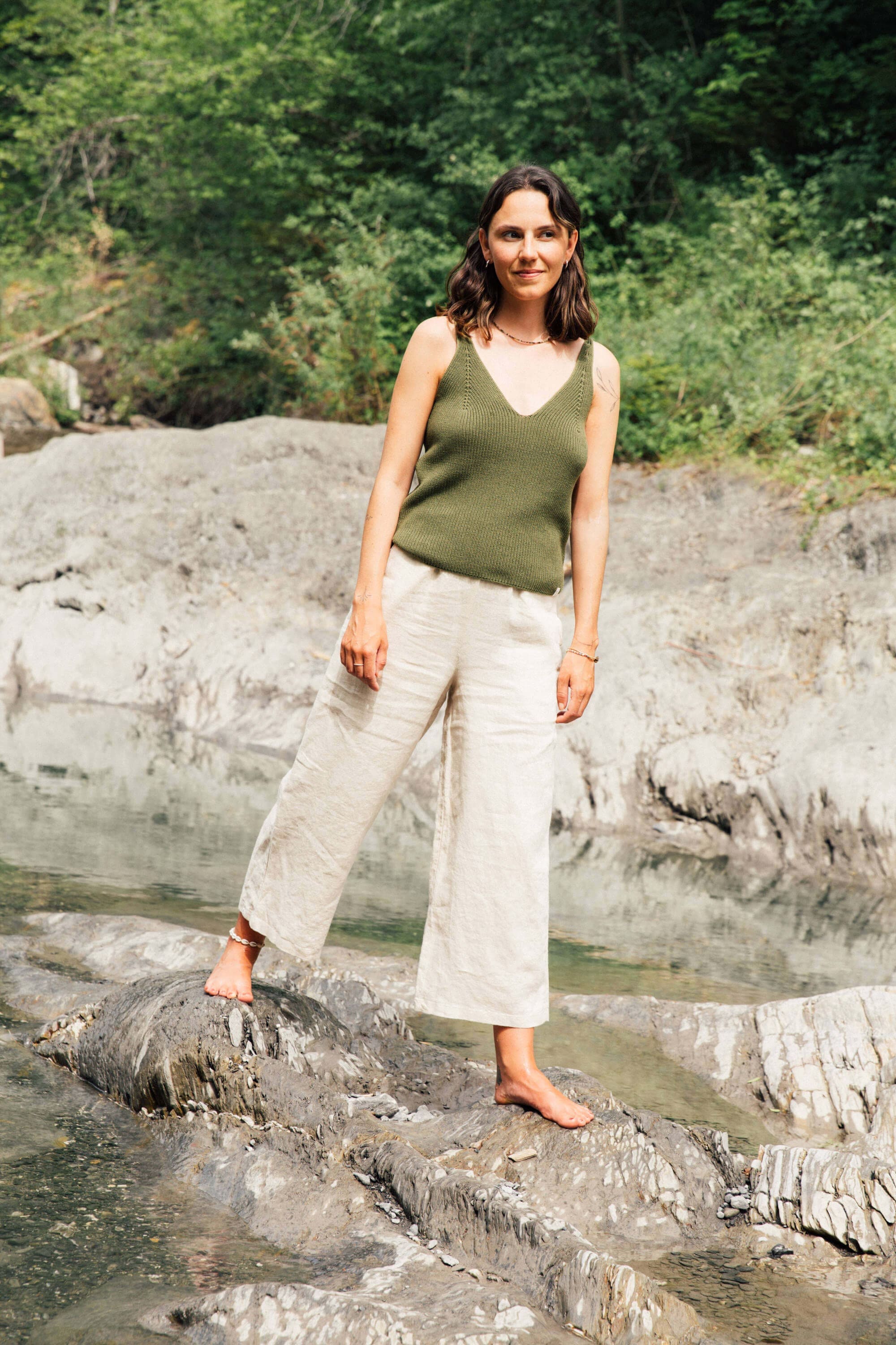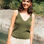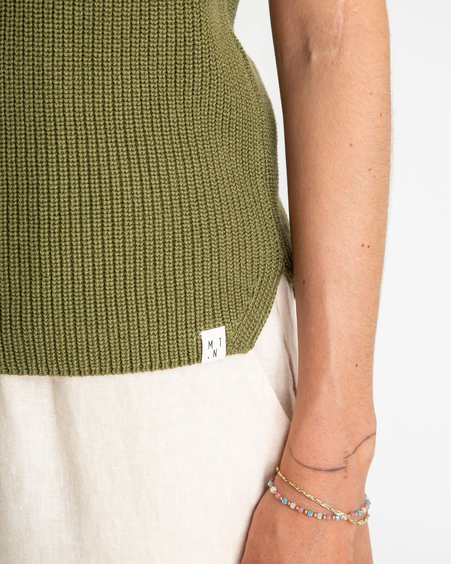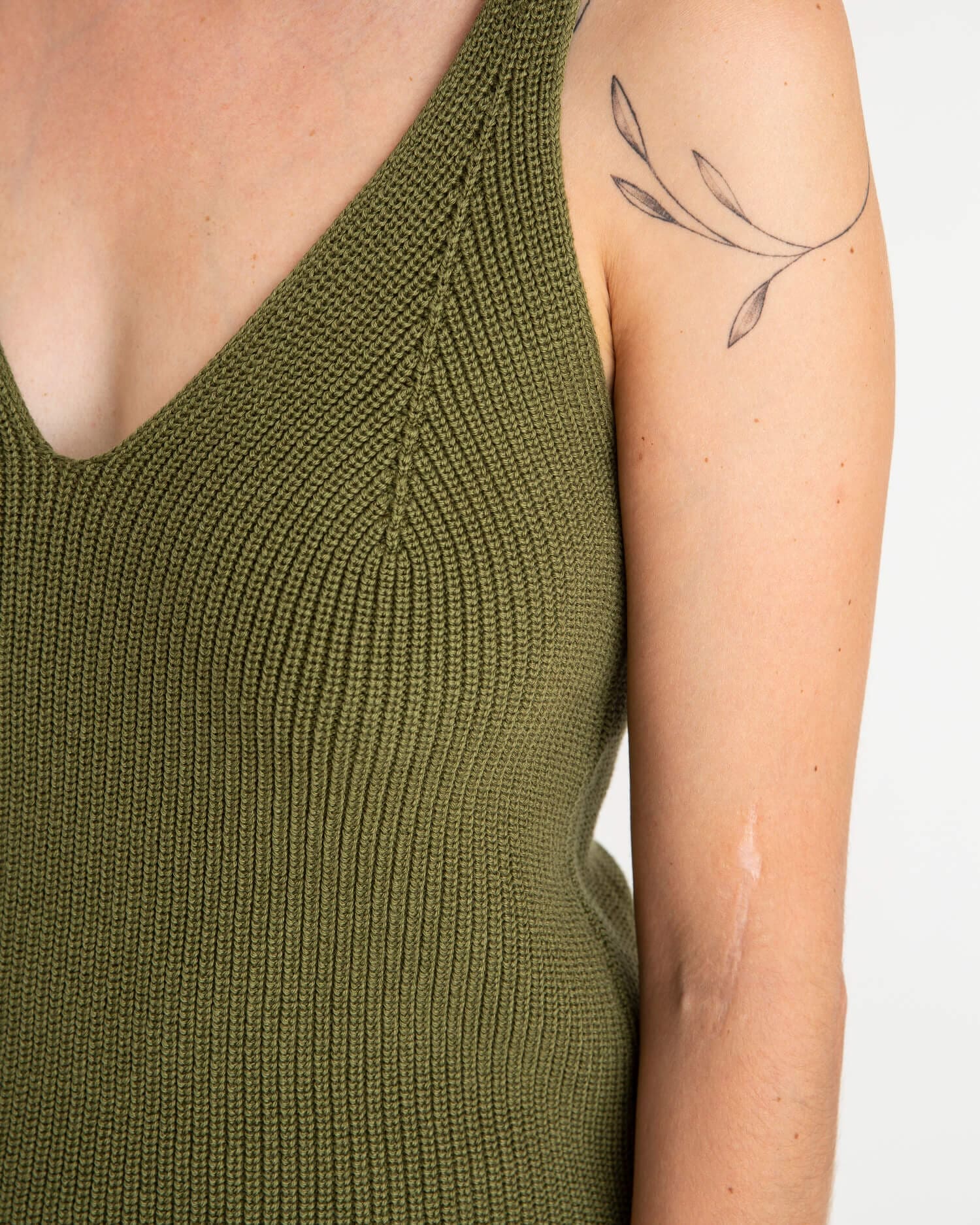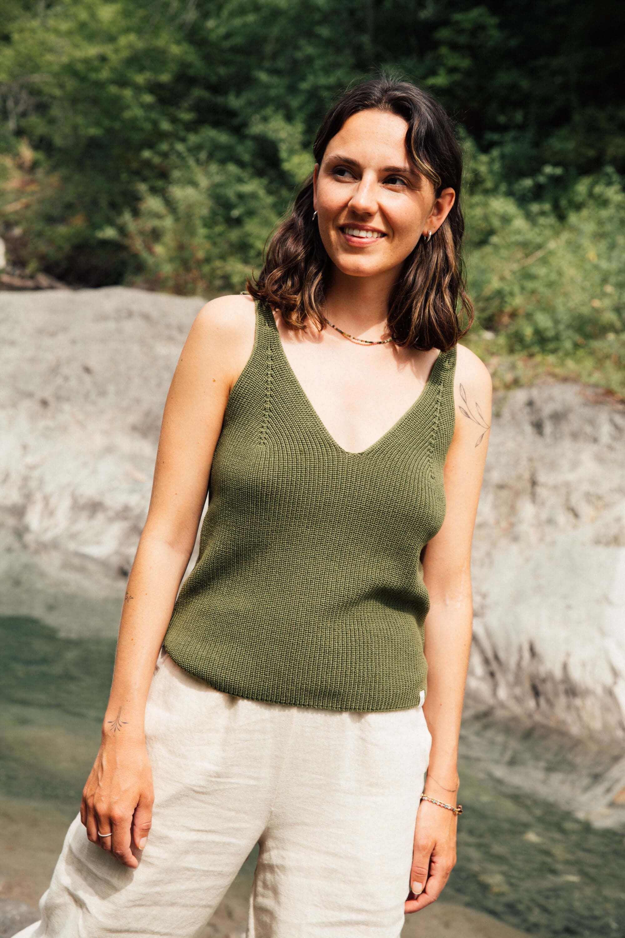 Unser gestricktes Tanktop ist die perfekte Balance zwischen lässig und schick, ein echter Allrounder - und einfach bequem! Das Muster aus biologischem Baumwollgarn verleiht dem Oberteil Textur und Dimension und wertet deinen Frühlings- und Sommerlook auf.