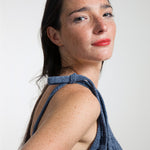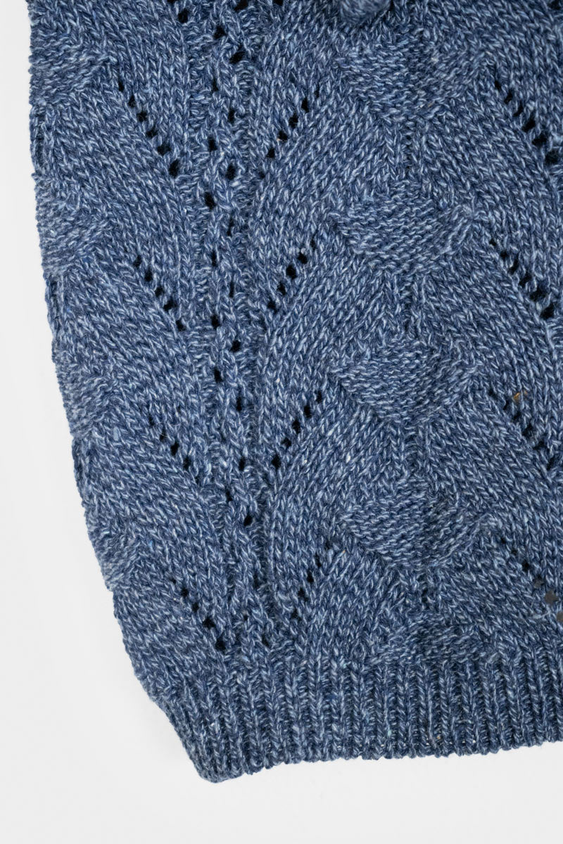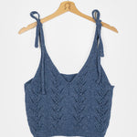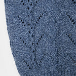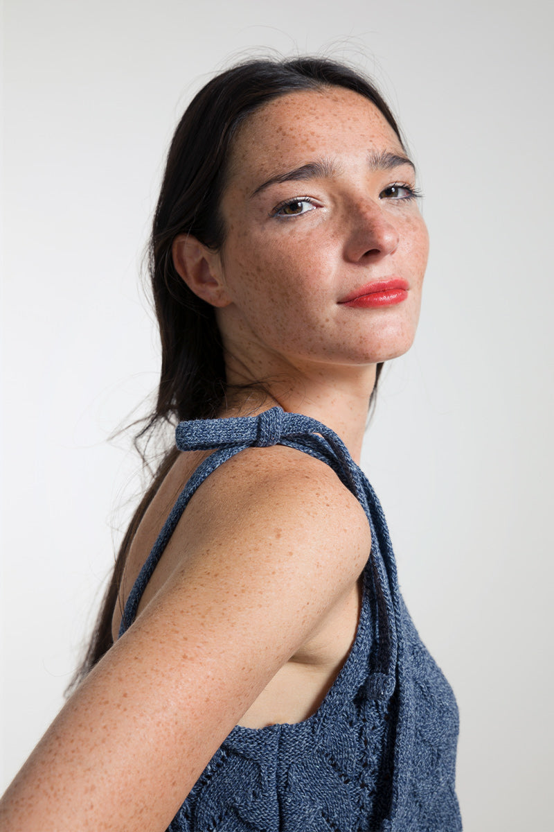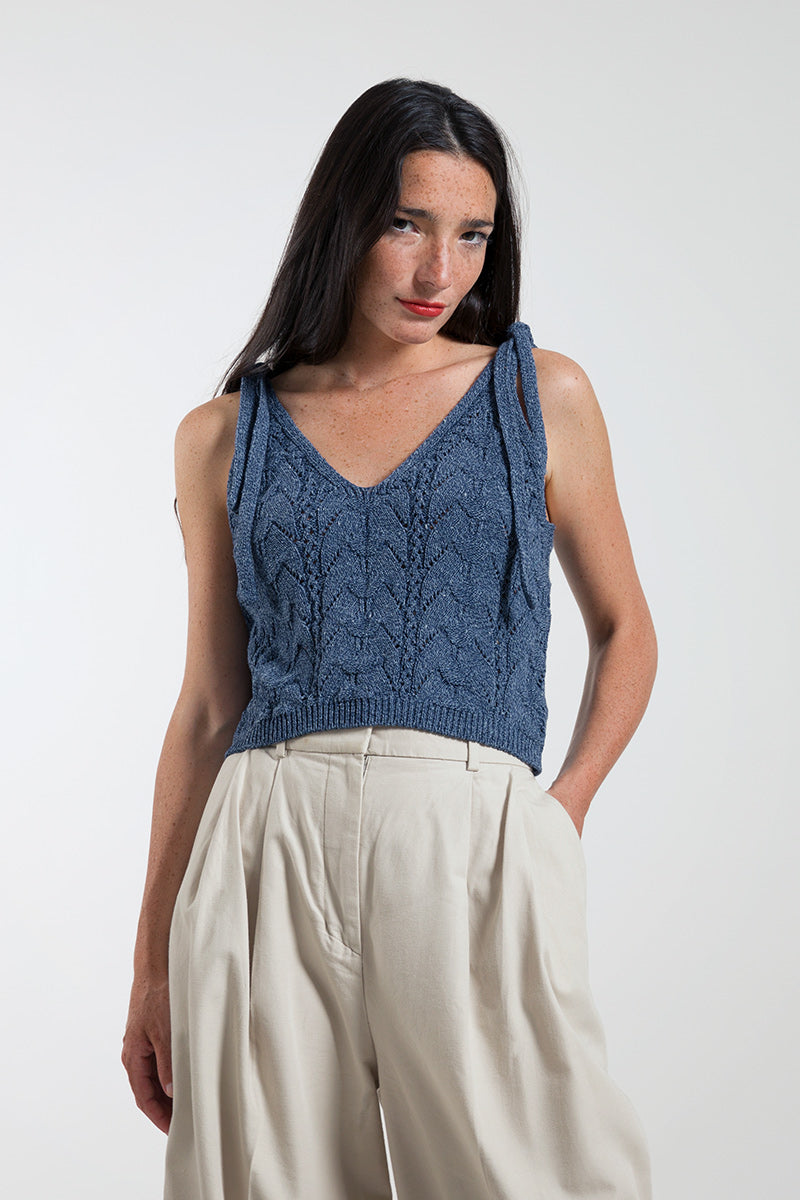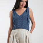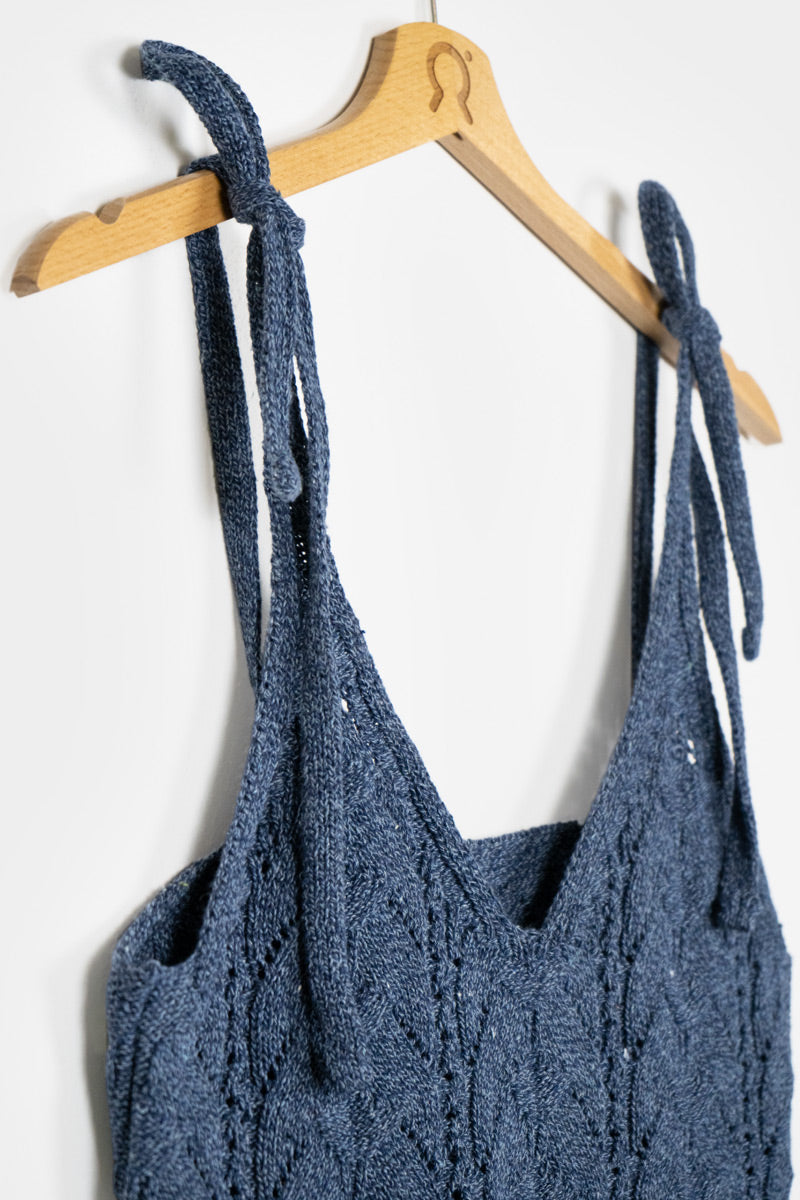 Das Stricktop René mit verstellbaren Trägern wird aus Garn hergestellt, das aus der Aufbereitung alter Jeans gewonnen wird. Dieses kurze Baumwolltop ist mit einem ganz besonderen Strickmuster gefertigt, das aussieht wie aus Omas Kleiderschrank, aber mit einem luftigen und modernen Design.