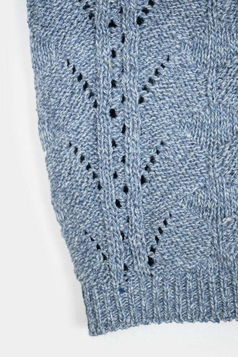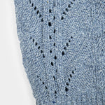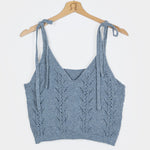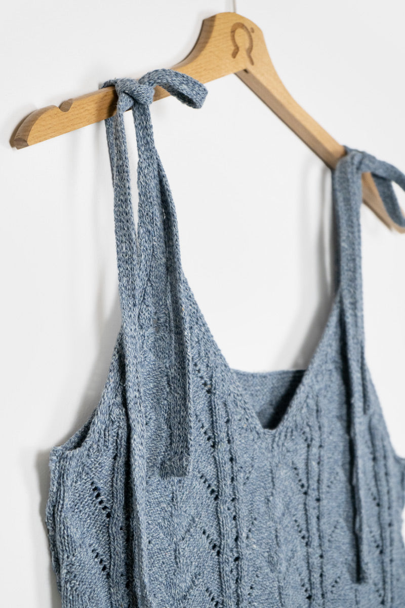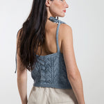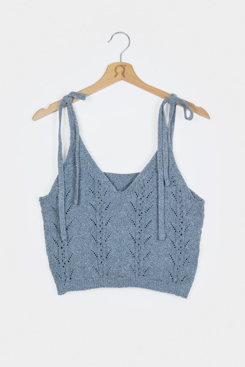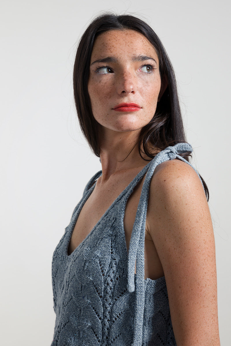 Das Stricktop René mit verstellbaren Trägern wird aus Garn hergestellt, das aus der Aufbereitung alter Jeans gewonnen wird. Dieses kurze Baumwolltop ist mit einem ganz besonderen Strickmuster gefertigt, das aussieht wie aus Omas Kleiderschrank, aber mit einem luftigen und modernen Design.